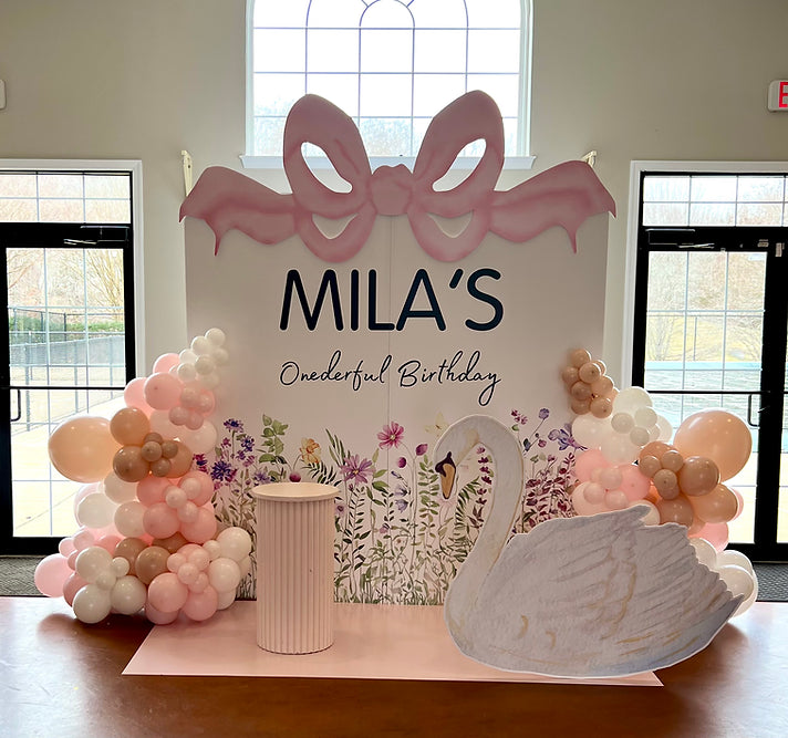 Mila’s display is perfect for any occasion! Two backdrop prints, two cutouts, floor print, cake stand and two half balloon... Read more